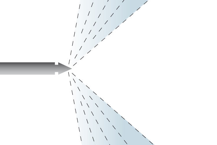 Der Breitsprühnagel hat an der Spitze zwei Düsenkränze, durch die das Wasser zu einem Wassernebelschirm versprüht