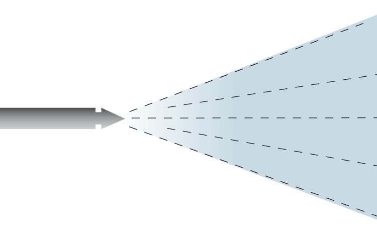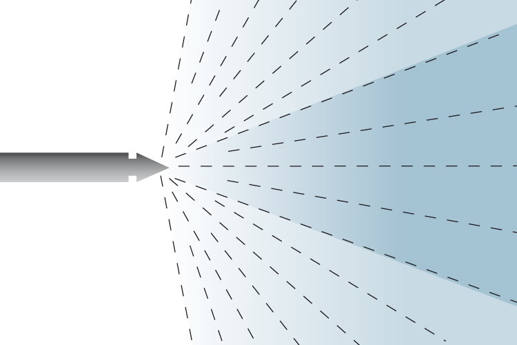 Der Weitsprühnagel hat an der Spitze einen Düsenkranz, durch den das Wasser kegelförmig versprüht wird. Mit dem